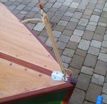 The lower mainsheet block is attached to a length of rope which is tied through holes in strengthened parts of the side decks.